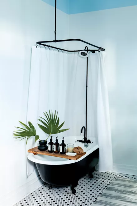 Οι μακριές κουρτίνες σε παλ απόχρωση δίνουν μια αίσθηση μεγαλοπρέπειας στο μπάνιο