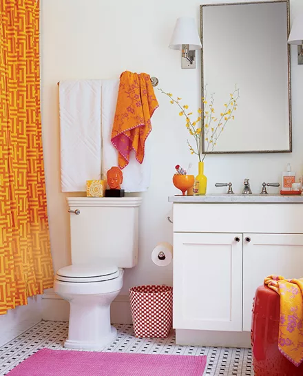 Το πορτοκαλί και το φούξια θα ζωντανέψουν ένα μικρό λευκό μπάνιο.