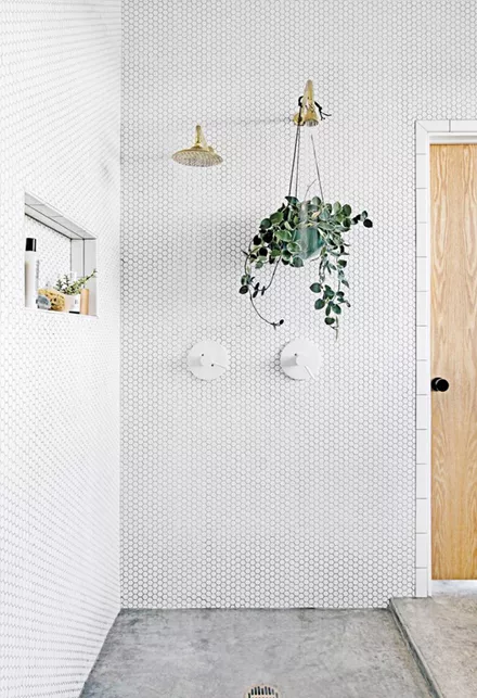 Ακόμα και ένα απόλυτα minimal μπάνιο μπορεί να δείξει πιο ζεστό με την προσθήκη πρασίνου. Μια κρεμαστή γλάστρα είναι ό,τι πρέπει!