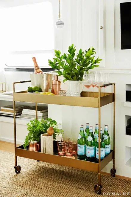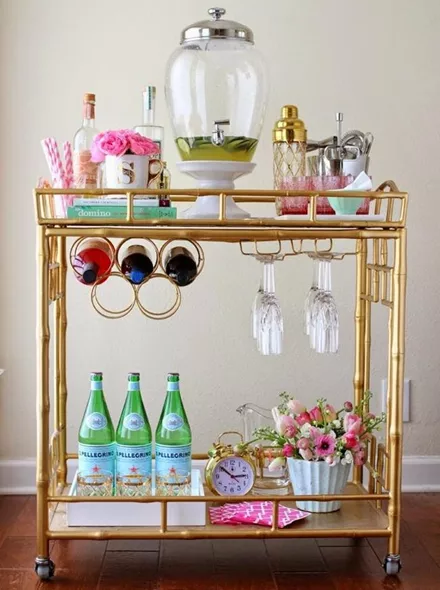 Ένα bar cart σε χρυσό χρώμα ταιριάζει υπέροχα με καφέ, μπρονζέ μπουκάλια και αξεσουάρ. Εκμεταλλεύσου το!