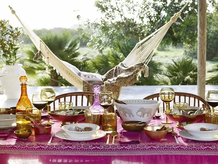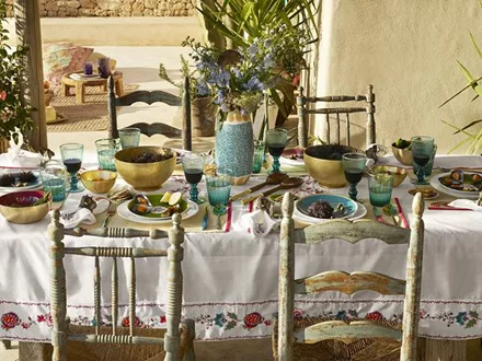 Ξύλινα ή μεταλλικά μπρονζέ σκεύη σερβιρίσματος και λευκά είδη με πολύχρωμα κεντήματα συνθέτουν το art de la table του συγκεκριμένου στυλ.