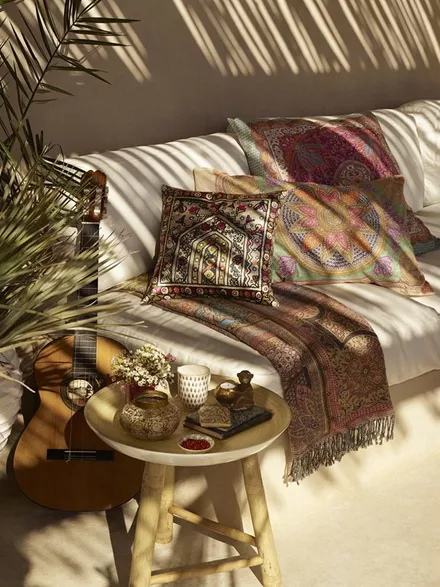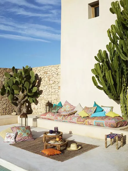 Με ethnic καλύμματα στα μαξιλάρια και αέρινα ριχτάρια σε πλούσιες αποχρώσεις μεταμόρφωσε την καθιστική γωνιά του μπαλκονιού ή του κήπου σου