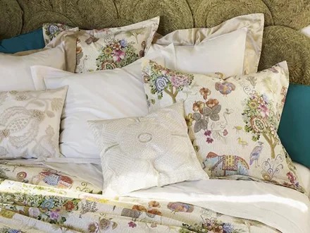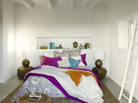 Το λευκό υπνοδωμάτιο γίνεται τόπος χαλάρωσης και χαράς με πινελιές από ζωηρά χρώματα που θυμίζουν έντονα τα παραδοσιακά ινδικά υφάσματα.