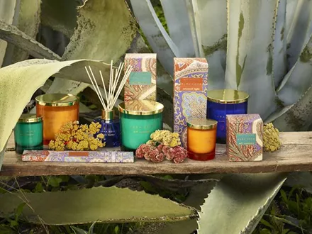 Η συλλογή ολοκληρώνεται με νέα αρωματικά στικ και κεριά σε συσκευασίες και μυρωδιές που μας ταξιδεύουν στη μαγική Ινδία.