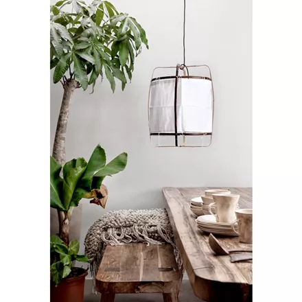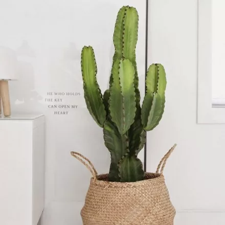 Ένα ψάθινο καλάθι αποκτά ρόλο κασπό και φιλοξενεί μια γλάστρα με κάκτο. Πρόσεξε πόσο αρμονικά δένει με το υπερμεγέθες λευκό κάδρο που είναι ακουμπισμένο στο πάτωμα