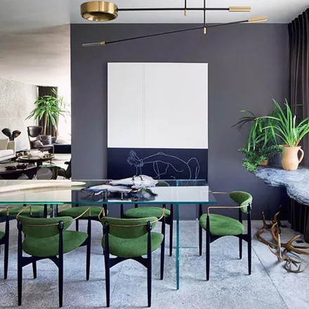 Η χρωματική ουδετερότητα του γκρι επιτρέπει παιχνίδια με κομμάτια από διαφορετικές δεκαετίες και αντίθετα υλικά όπως το γυαλί, το βελούδο και ο γρανίτης
