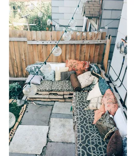 Έχεις μεγάλη παρέα; Δημιούργησε ένα μεγάλο γωνιακό καναπέ με παλέτες και μαξιλάρια! Τα φωτάκια εξωτερικού χώρου είναι πάντα μία πολύ όμορφη προσθήκη.