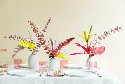 Κόψε κλαράκια από πρασινάδες και βάψτα με σπρέι σε ζωηρά χρώματα για ένα μίνιμαλ εναλλακτικό σκηνικό στο τραπέζι.
