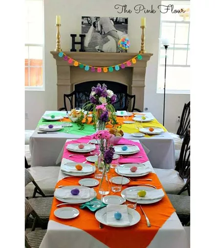 Αγκάλιασε το χρώμα! Βάψε κάθε αυγό με διαφορετικό χρώμα (ακόμα και με παιδικούς μαρκαδόρους) και "στρώσε" το τραπέζι με γκοφρέ χαρτί σε πολλά χρώματα! Παιδικό πάρτυ ή Πάσχα; Και τα δύο!
