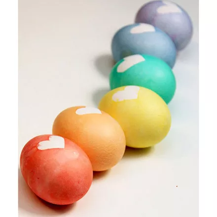 Heart: Πριν βουτήξεις τα αυγά στο χρώμα κόλλα πάνω τους αυτοκόλλητα σε σχήμα καρδιάς. Για απαλά φυσικά χρώματα δες εδώ.