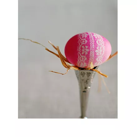 Lace: Δέσε δαντελένια κορδέλα γύρω από τα αυγά. Αν μάλιστα το κάνεις πριν τα βάψεις, το τύπωμα θα μείνει πάνω στο αυγό!