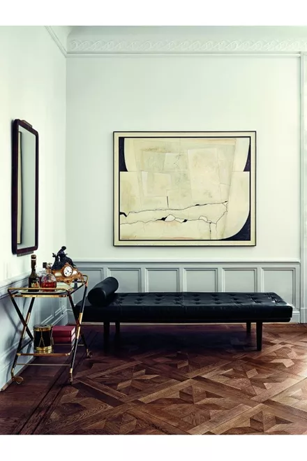 Το φυσικό φως που μπαίνει από τα μεγάλα art nouveau παράθυρα γλυκαίνει τα αυθεντικά ξύλινα πατώματα και ταιριάζει με τις ήρεμες αποχρώσεις του γκρι και του καφέ. Mοναδική εξαίρεση ορισμένα κομμάτια σε πράσινο και μπλε