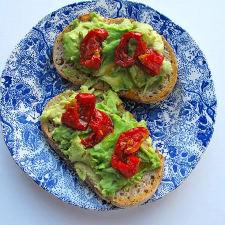 13:00 μμ- μεσημεριανό Ένα κομμένο αβοκάντο, 20 γρ κομμένες λιαστές ντομάτες και 2 φέτες ψωμί με προζύμι.