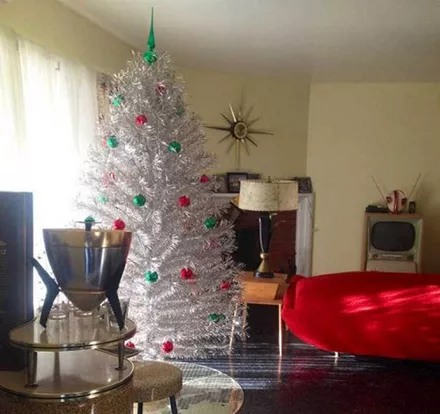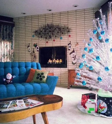 Τα ασημένια δέντρα ξανακάνουν trending στην εορταστική διακόσμηση. Πρόσεξε το συνδυασμό του καναπέ με τις μπάλες