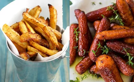 Ψητά λαχανικά αντί για πατάτες τηγανιτές:Συνόδευσε τα πιάτα σου με τον πιο υγιεινό τρόπο, αποφεύγοντας τις τηγανιτές πατάτες και χωρίς να εννοούμε τη σαλάτα. Αντικατάστησέ τες με ψητά λαχανικά, όπως τα καρότα, τα οποία όταν ψηθούν στο φούρνο θυμίζουν γευστικά τις γλυκοπατάτες, αλλά και με γλυκοπατάτες, αφού είναι έξτρα υγιεινές.