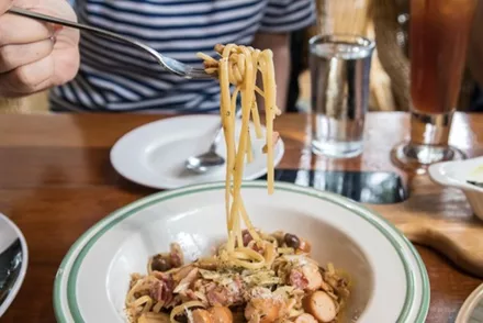 Μην παίρνεις ως παράδειγμα μερίδας αυτή που βλέπεις στα εστιατόρια, αφού τα πιάτα περιέχουν πολύ μεγάλες ποσότητες φαγητού. Μία μικρή μερίδα ζυμαρικών, που ισούται περίπου με μία κούπα και έχει γύρω στις 200 θερμίδες, είναι αρκετή για το γεύμα σου.