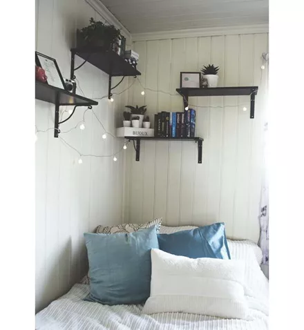 Η γωνιά πάνω από το κρεβάτι μπορεί να μεταμορφωθεί σε μίνι βιβλιοθήκη και να αποτελέσει στήριγμα για τα ρομαντικά σου φώτα.