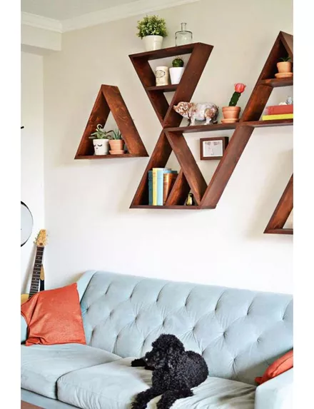 Μερικά τριγωνικά ράφια είναι τέλεια για να δημιουργήσεις εφέ πάνω από τον καναπέ.