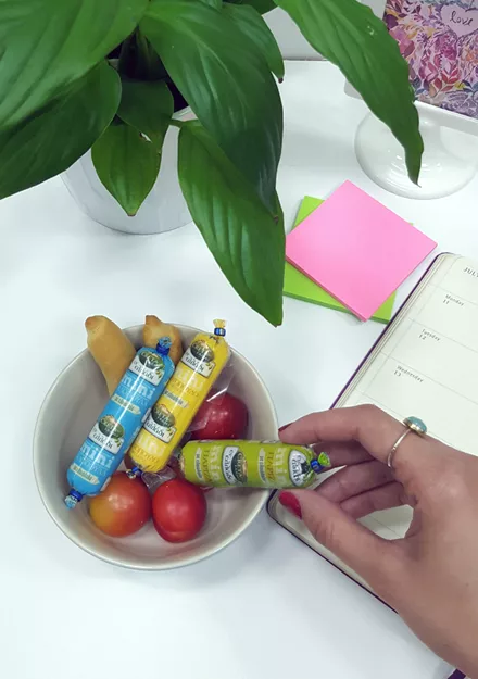 "Τέλεια για το δεκατιανό σνακ, τα Mini Εν Ελλάδι έχουν κερδίσει καθημερινή θέση στο γραφείο μου όπου και, ιδανικά, τα απολαμβάνω μαζί με κριτσίνια και ντοματάκια. Χωρίς λερωμένα σκεύη, χωρίς καν λερωμένα...χέρια, με υπέροχη γεύση αλλαντικού, σαν να κόπηκε εκείνη την στιγμή, και ενέργεια που χρειάζομαι για να συνεχίσω"! – Κέλλυ