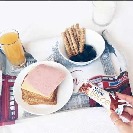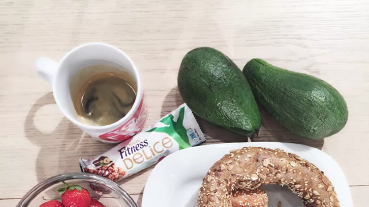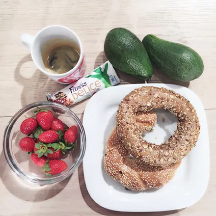 Η Μαρία Ηλιάκη ξεκινά την ημέρα της με πολύσπορο κουλούρι Θεσσαλονίκης, αβοκάντο, φράουλες, μία μπάρα δημητριακών Fitness Delice και καφέ.