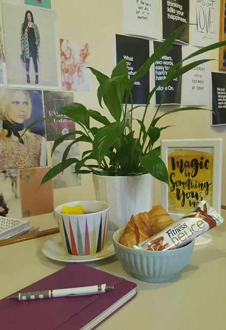 Η Κέλλυ φροντίζει να απολαμβάνει ένα χορταστικό πρωινό ακόμα και στο γραφείο, πάντα μαζί με κούπα τσάι.