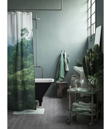 Ξεκίνα την τροπική μεταμόρφωση από το μπάνιο με μία ανάλογη κουρτίνα πράσινες και λευκές πετσέτες και, φυσικά, ένα όμορφο φυτό