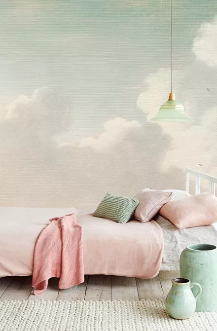 Ένα δωμάτιο με ethnic ή boho χαρακτήρα μπορεί να δείξει πιο μοντέρνο και edgy με μία αφηρημένη ταπετσαρία που θυμίζει ουρανό με σύννεφα.