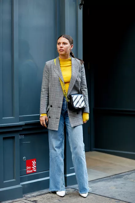 Φόρεσε ένα φαρδύ τζιν μαζί με ένα καρό blazer για τέλειο look σε κάθε πρωινή περίσταση.