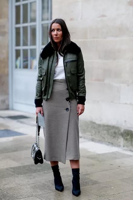 #6 Ανάμειξε θηλυκά και αρρενωπά κομμάτια σε κάθε εμφάνιση (εδώ η wrap skirt συναντά το αρρενωπό utility jacket)