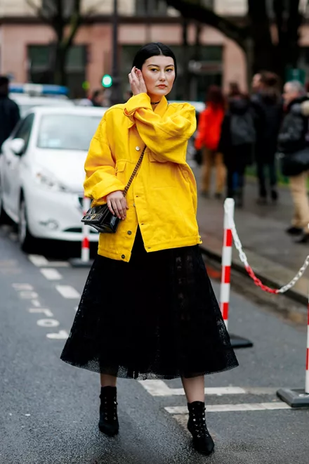 #8 Χρησιμοποίησε το χρώμα με αναπάντεχο τρόπο (εδώ το κίτρινο σε ένα oversized denim jacket και στη σκιά)