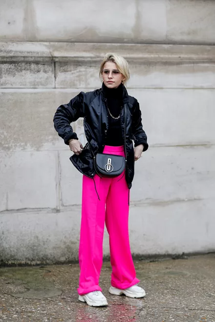#10 Υιοθέτησε άφοβα τα trends με τον δικό σου τρόπο (εδώ πχ το φούξια παντελόνι συνδυάστηκε άφοβα με αθλητικά με αερόσολα και σατινέ jacket)