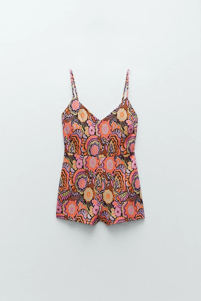 Ο λόγος για μία εμπριμέ λουλουδάτη κοντή ολόσωμη φόρμα με V ντεκολτέ και λεπτές τιράντες που συγκεντρώνει στο σχέδιο της διάφορα trends της εποχής: είναι φλοράλ, και μάλιστα το λουλουδάτο μοτίβο της αποπνέει μία ρετρό αισθητική η οποία έχει επιστρέψει στη μόδα, είναι κοντή κι εφαρμοστή, που παραπέμπει στο top summer trend με τα "ποδηλατικά" σορτς, κι είναι stylish και comfort όπως ακριβώς επιτάσσει το κυρίαρχο στιλ όλη της χρονιάς.