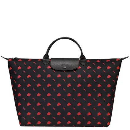 Το σύνθημα δίνουν τα έντονα λευκά γράμματα στις μαύρες τσάντες Le Pliage®, το οποίο συνοδεύεται από το "Professional Heartbreaker" και τη ματωμένη