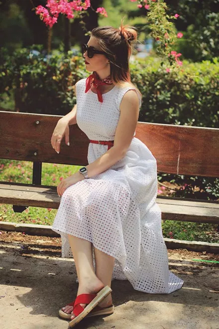 Η Στεφανία φόρεσε ένα πολύ κομψό μάξι broderie φόρεμα και το φώτισε με κόκκινα αξεσουάρ. (Not For Sale)