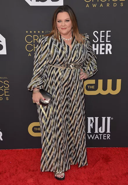 H Melissa McCarthy, που έδειξε τον ενθουσιασμό της φορώντας φλατ σανδάλια Chloe στο κόκκινο χαλί, επέλεξε μία εμπριμέ δημιουργία του brand Figure Love.