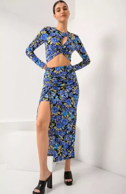 Two piece με κροπ τοπ με cut out λεπτομέρεια και midi φλοράλ φούστα με άνοιγμα στο μπροστινό μέρος και λεπτομέρεια σούρας, Pink Woman
