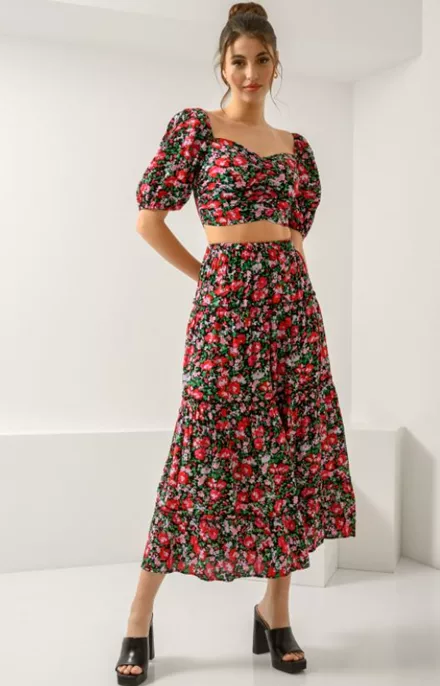 Two piece με φλοράλ κροπ τοπ με κοντά, puffy μανίκια και τετράγωνο ντεκολτέ και ψηλόμεση midi φλοράλ φούστα με βολάν και λάστιχο στη μέση, Pink Woman