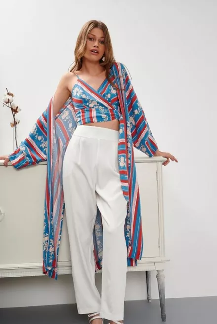 Αναζητώντας το ιδανικό σχέδιο ανακαλύψαμε το look της Ελένης Βουλγαράκη και ευθύς σταματήσαμε. Η ίδια φοράει ένα υπέροχο εμπριμέ κιμονό με ρίγες και φλοράλ print, που φέρε πολλά ευέλικτα χρώματα, που επιτρέπουν τον συνδυασμό του με τα περισσότερα κομμάτια της καλοκαιρινής γκαρνταρόμπας. Είναι μίντι και δένει σταυρωτά με μία ζώνη. Ανήκει στη νέα συλλογή της Attrattivo και κοστίζει 79,90€.