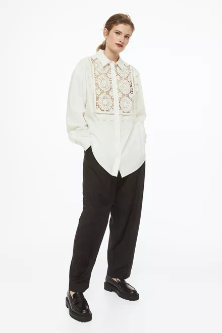 Η ηθοποιός επέλεξε να φορέσει σε τηλεοπτική εμφάνιση της ένα ψηλόμεσο κομψό παντελόνι το οποίο συνδύασε με κρεμ loose πουκάμισο με δαντέλα από τα H&M ενώ το look της ολοκλήρωσε με snakeskin μποτάκια με χαμηλό τακούνι. Το πουκάμισο που επέλεξε η Τζένη Θεωνά είναι η μία απόλυτα minimal και ταυτόχρονα stylish επιλογή για τα καθημερινά μας looks καθώς το κρεμ πουκάμισο με δαντέλα προσδίδει extra fashionable πόντους στο outfit μας ενώ μπορείς να το συνδυάσεις με μεγάλη επιτυχία και με τα υπόλοιπα παντελόνια σου.