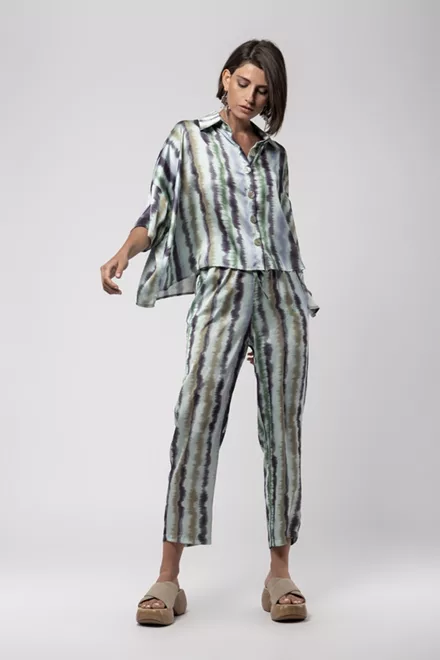 Ένα πολύ άνετο και stylish βραδινό σύνολο επέλεξε η Κατερίνα Παπουτσάκη σε βραδινή έξοδο της και μας έδωσε έμπνευση για το πως μπορούμε να είμαστε κομψές και άνετες. Συγκεκριμένα η Κατερίνα Παπουτσάκη επέλεξε ένα twin set της σχεδιάστριας Νάντιας Ράπτη το οποίο αποτελείται από πράσινο εμπριμέ παντελόνι και ασορτί V neck πουκάμισο. Το look της ολοκλήρωσε με μαύρο crop top και μαύρα άνετα flat σανδάλια.
