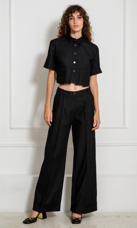 Ένα πολύ κομψό back to work look επέλεξε η Χριστίνα Κοντοβά για την επιστροφή της στο γραφείο δημιουργώντας ένα φθινοπωρινό σύνολο με την denim on denim τάση. Η Χριστίνα Κοντοβά επέλεξε ένα denim crop πουκάμισο σε σκούρα απόχρωση το οποίο συνδύασε με ασορτί denim wide leg παντελόνι σε σκούρα απόχρωση, και τα δύο κομμάτια από τη νέα συλλογή του brand της Ckontova.