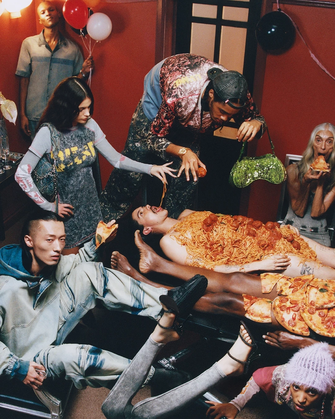 Οι ποικιλόμορφοι ένοικοι, ντυμένοι με Diesel, που καλύπτουν ηλικίες, φυλές, φύλα και σωματότυπους, διοργανώνουν ένα σουρεαλιστικό δείπνο όπου ο ενδυματολογικός κώδικας είναι denim Summer Casts. Όταν ένα μέλος του σπιτιού οδηγεί ένα αυτοκίνητο μέσα από το σαλόνι, δύο άλλοι ποζάρουν στο καπό με φωτεινά κόκκινα και κίτρινα δερμάτινα looks Sporty Racer. Όλοι οι άλλοι στέκονται ατάραχοι με moto jackets με ρίγες και denim με λεπτομέρειες αγωνιστικών αυτοκινήτων. Στην κουζίνα, που έχει μετατραπεί σε σαλόνι ομορφιάς, οι ένοικοι περιμένουν θεραπείες αποτρίχωσης ποδιών, φορώντας ζακάρ κομμάτια, αλλά και items με κρόσσια ή denim από την SS25 συλλογή της Diesel. Άλλα πλάσματα, συμπεριλαμβανομένου ενός πουλιού, συρρέουν στο πράσινο υπνοδωμάτιο για να χαλαρώσουν με trompe l’oeil lingerie looks.