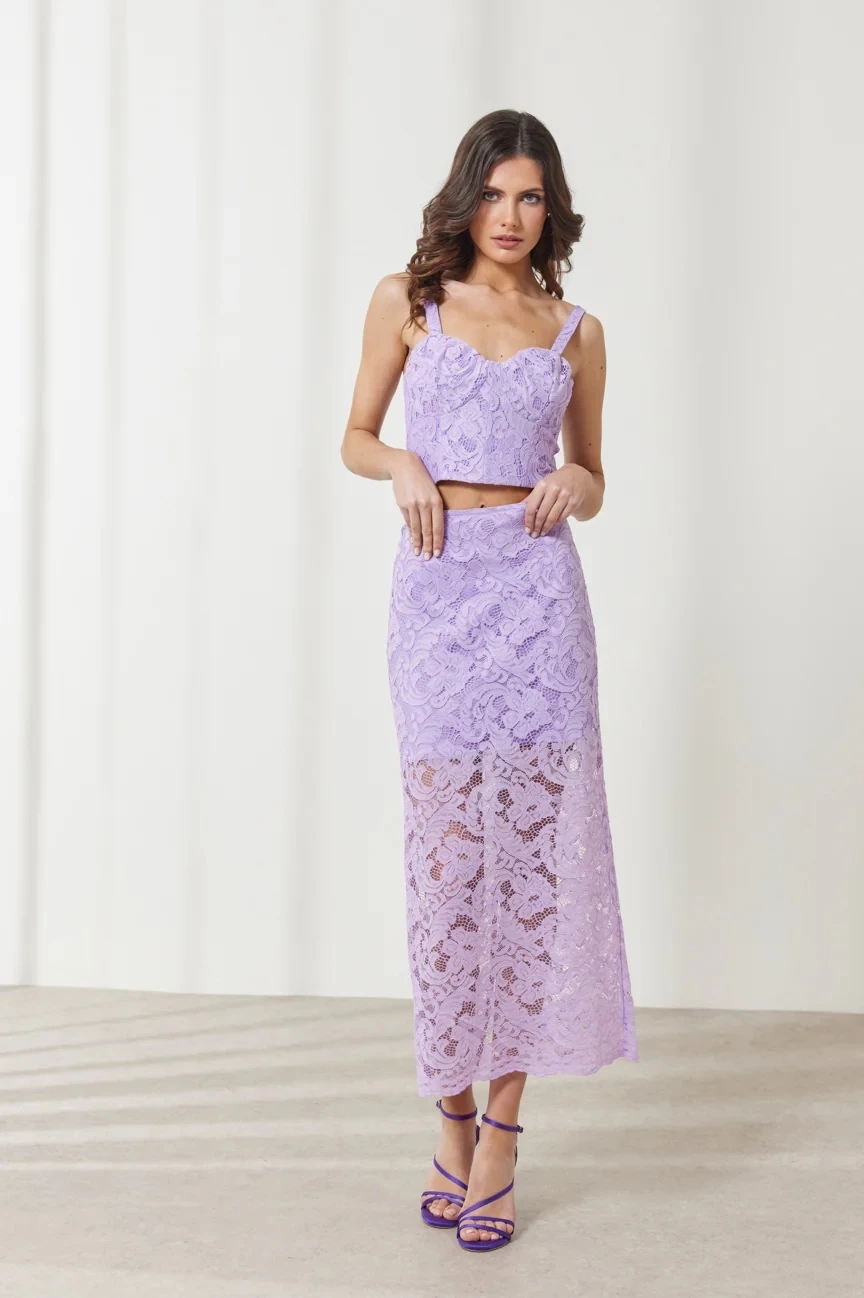3. Lavender Romance – Μίντι φούστα δαντέλα σε λιλά