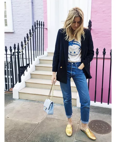 Σκούρο τζιν παντελόνι + Ανοιχτόχρωμο blazer