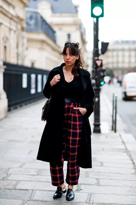Η Vanessa (UneArmoirePourDeux) φοράει το νέο must have shoe trend, το εξώφτερνο loafer και μάλιστα το συνδυάζει με ψηλόμεσο baggy καρό παντελόνι