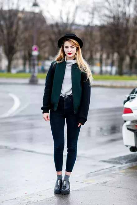 Η Elisa Baudoin υπενθυμίζει πως κάποια items δείχνουν πάντα στυλάτα. Πχ, ένα κολεγιακό τζάκετ, skinny jeans, ζιβάγκο και καπέλο.