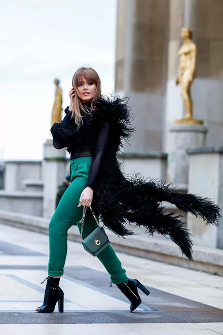 Η Kristina Bazan κάνει τη διαφορά με πράσινο παντελόνι και μάξι γιλέκο με φτερά