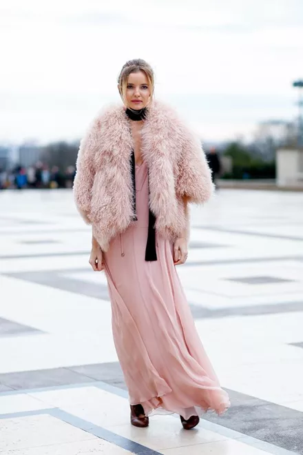 Η Natayakim συνδυάζει μάξι φόρεμα και γούνα στο χρώμα της πούδρας εξυμνώντας έτσι το πιο σικ χρώμα της άνοιξης που έρχεται