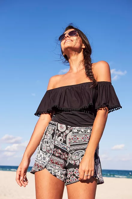 Φόρεσε το έξωμο τοπ μαζί με το σορτς και στην παραλία για ένα look που ταιριάζει σε κάθε περίσταση. @zoekarapetyan
