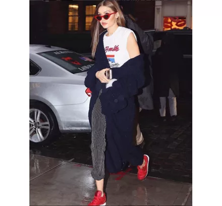 Η Gigi Hadid επαναφέρει στο προσκήνιο τα ρετρό Reebok αθλητικά και τα συνδυάζει με 50s γυαλιά πεταλούδες.